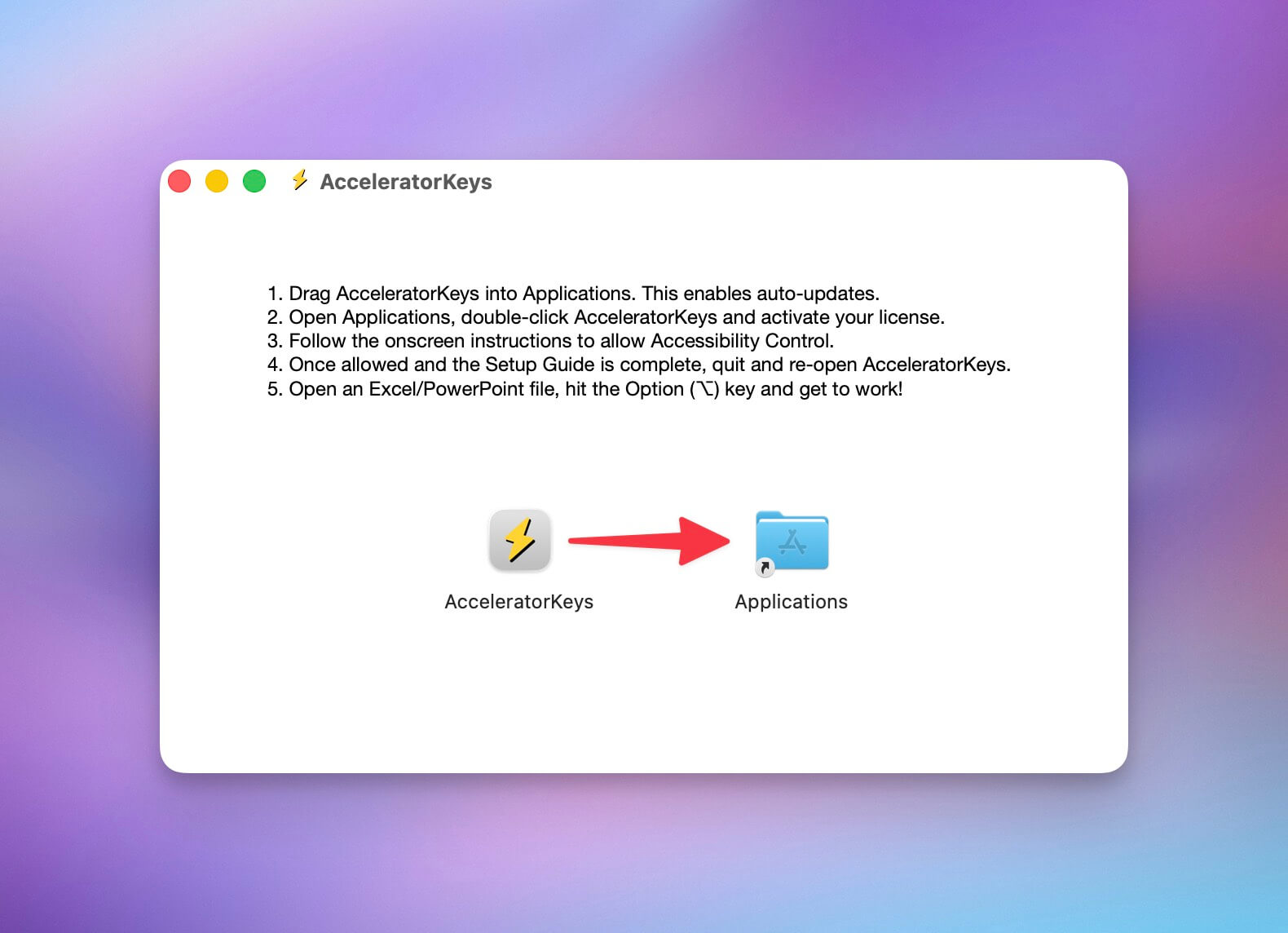 In the window that appears, drag the AcceleratorKeys icon into the Applications folder to enable auto-updates.