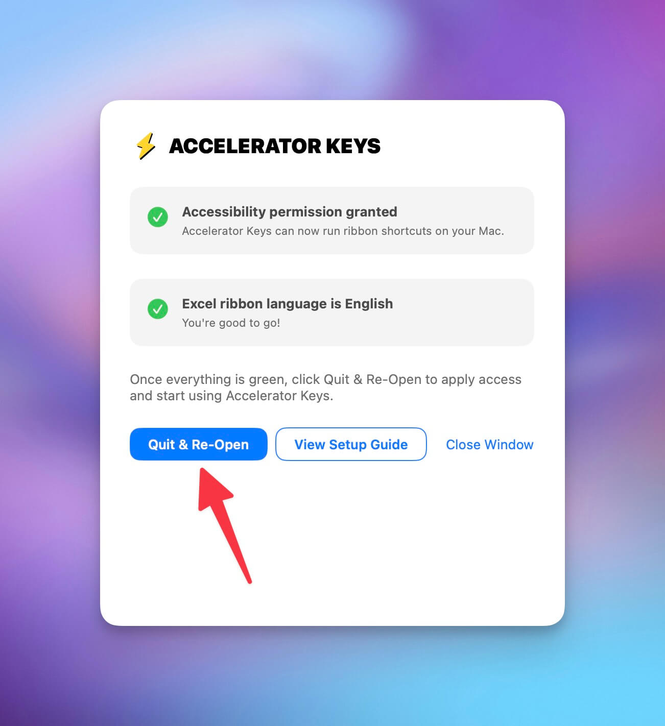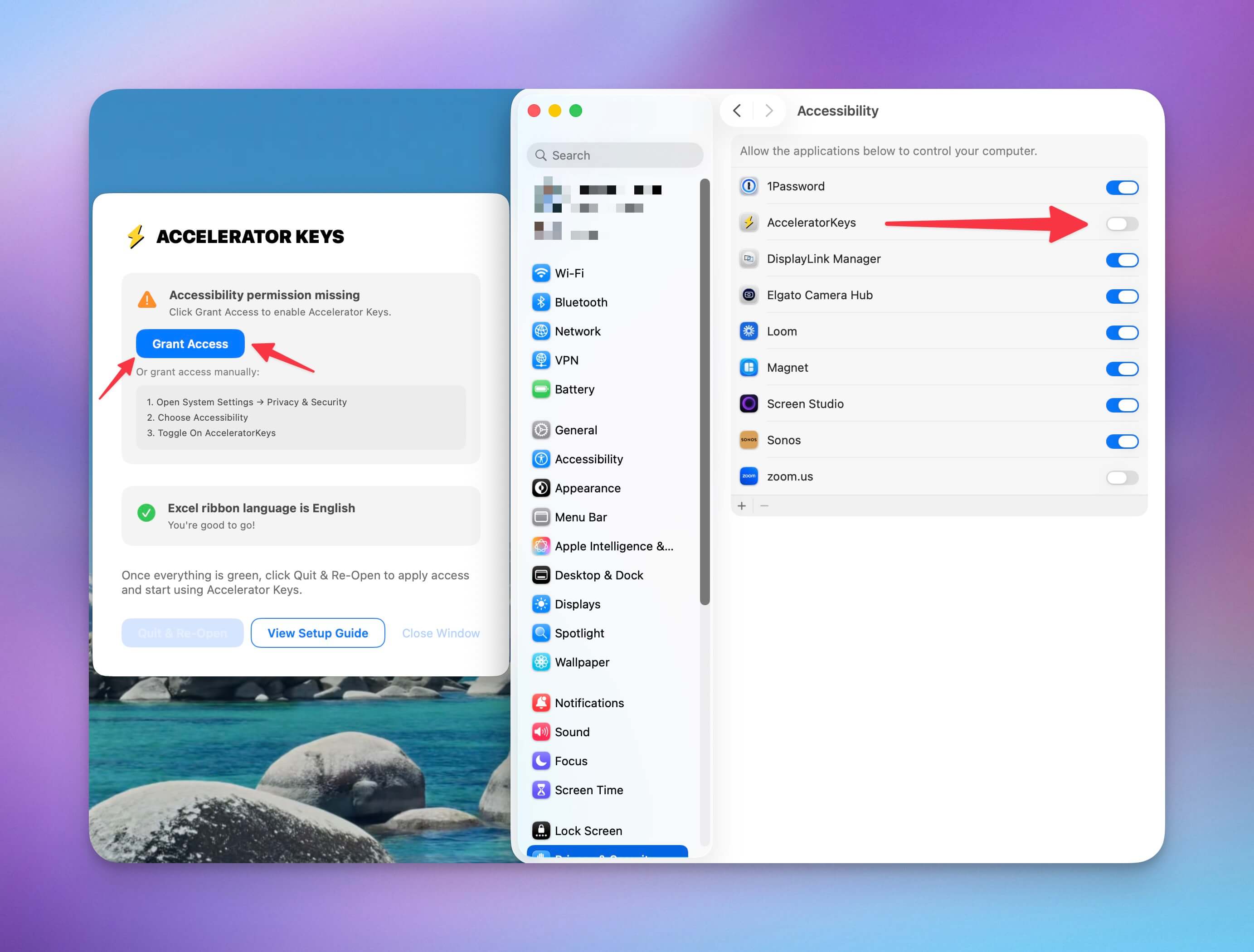 On the next screen, click on Grant Access and then toggle on AcceleratorKeys to enable necessary permissions to run ribbon shortcuts.